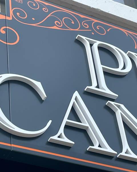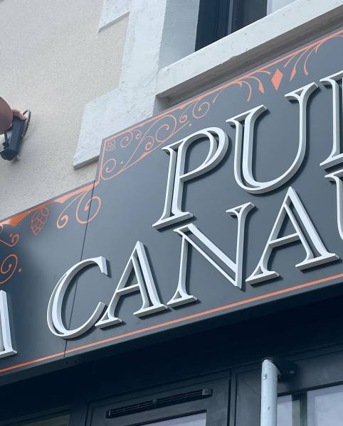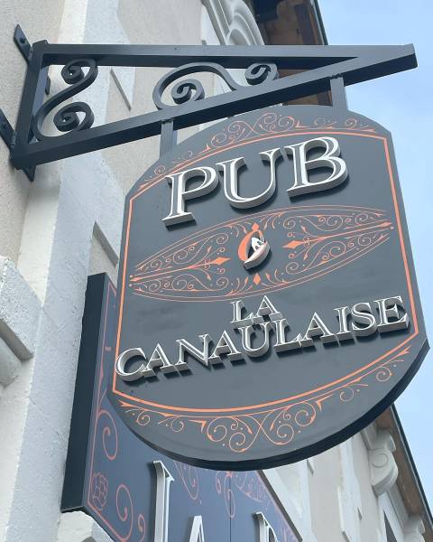 Découvrez notre dernière réalisation : la création et la pose d'une enseigne non-lumineuse avec un fond en tôle laquée, avec des bords pliés, et du lettrage en pvc découpé et ce, pour un pub situé à Lacanau.