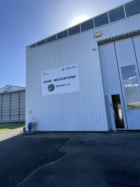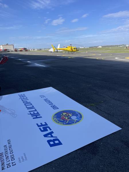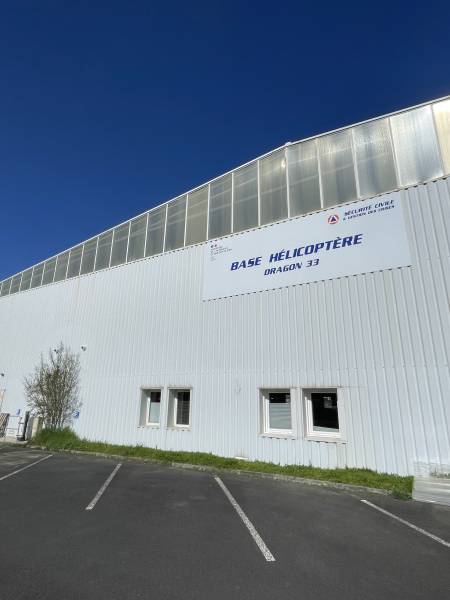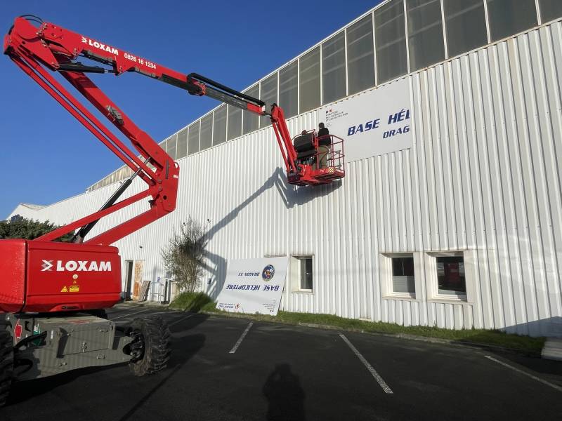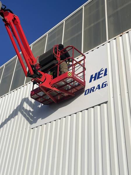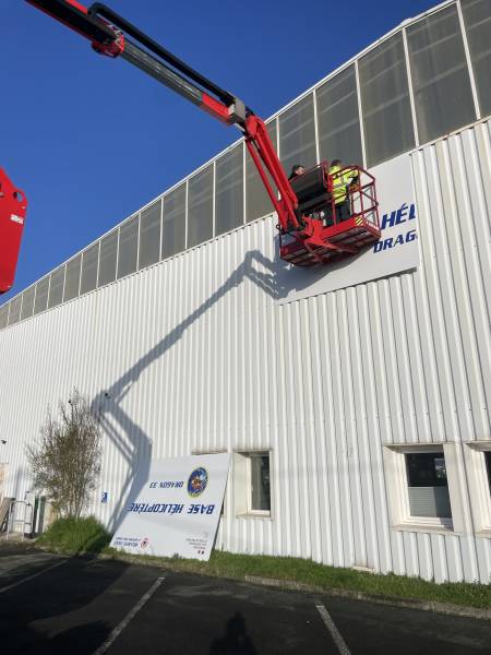 Pour la pose de cette enseigne pour la Sécurité Civile, la base de Dragon 33 à l'aéroport de Mérignac nos poseurs ont fait appel à la société Loxam pour la location d'une nacelle élévatrice. Nous nous sommes chargé d'obtenir toutes les autorisations nécessaires que suscitent une telle pose d'enseigne.
