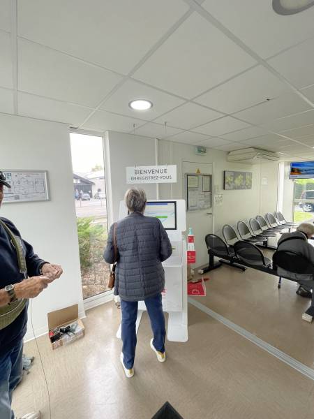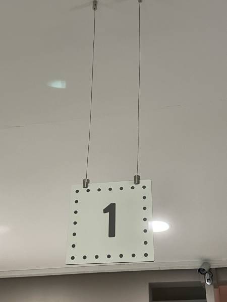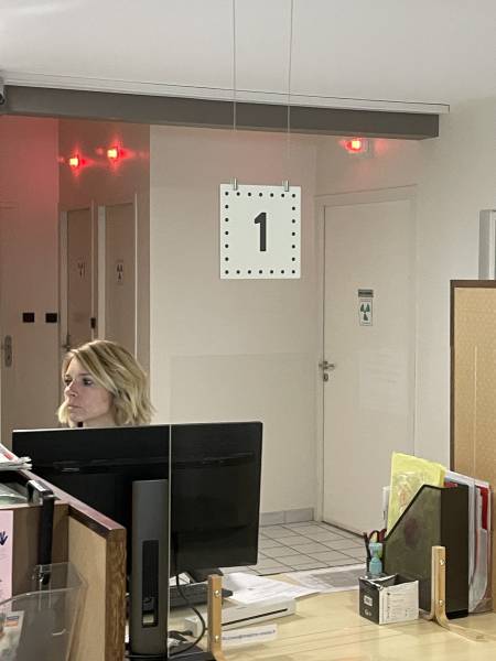 Pour le centre de radiologie Enosis à Créon près de Bordeaux, qui a récemment installé une borne d'accueil pour l'enregistrement de ses patients, nous avons conçu des panneaux de signalétique pour diriger les patients vers la borne, puis vers le bureau d'accueil dédié. Ces panneaux en aluminium dibond ont été fixé au plafond avec des câbles de suspension en inox.
